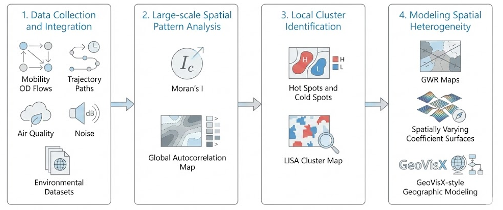 4. Modeling Spatial Heterogeneity: Finally, we employ spatially varying coefficient models, such as GWR (Geographically Weighted Regression) or utilize the GeoVisX platform [1][2], to model the potential relationship between mobility intensity and exposure outcomes. By conducting this in-depth spatial analysis, we examine how the influence of human mobility on environ-mental exposure varies across different locations. This approach leverages geographic model-ing to reveal nuanced dynamics and spatial non-stationarity that might otherwise remain hid-den in Large-scale regression models.
