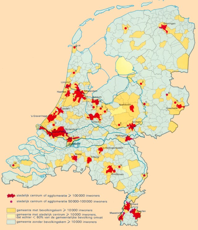 | In 1971 is volgens de volkstelling het aantal plaatsen en agglomeraties met meer dan 10.000 inwoners toegenomen tot in totaal 175, waarvan 143 in de grootteklasse 10.000 tot 50.000 inwoners. De kaart laat duidelijk zien, dat het aantal gemeenten waarvan de hoofdkern tenminste 10.000 inwoners telde, aanzienlijk is toegenomen in de Randstad, in Noord-Brabant en op de Veluwe. Ook het aantal middelgrote steden is gegroeid. Van de ruim 13,7 miljoen inwoners in 1971, woonde 62,7 % in een plaats van 10.000 of meer inwoners. |