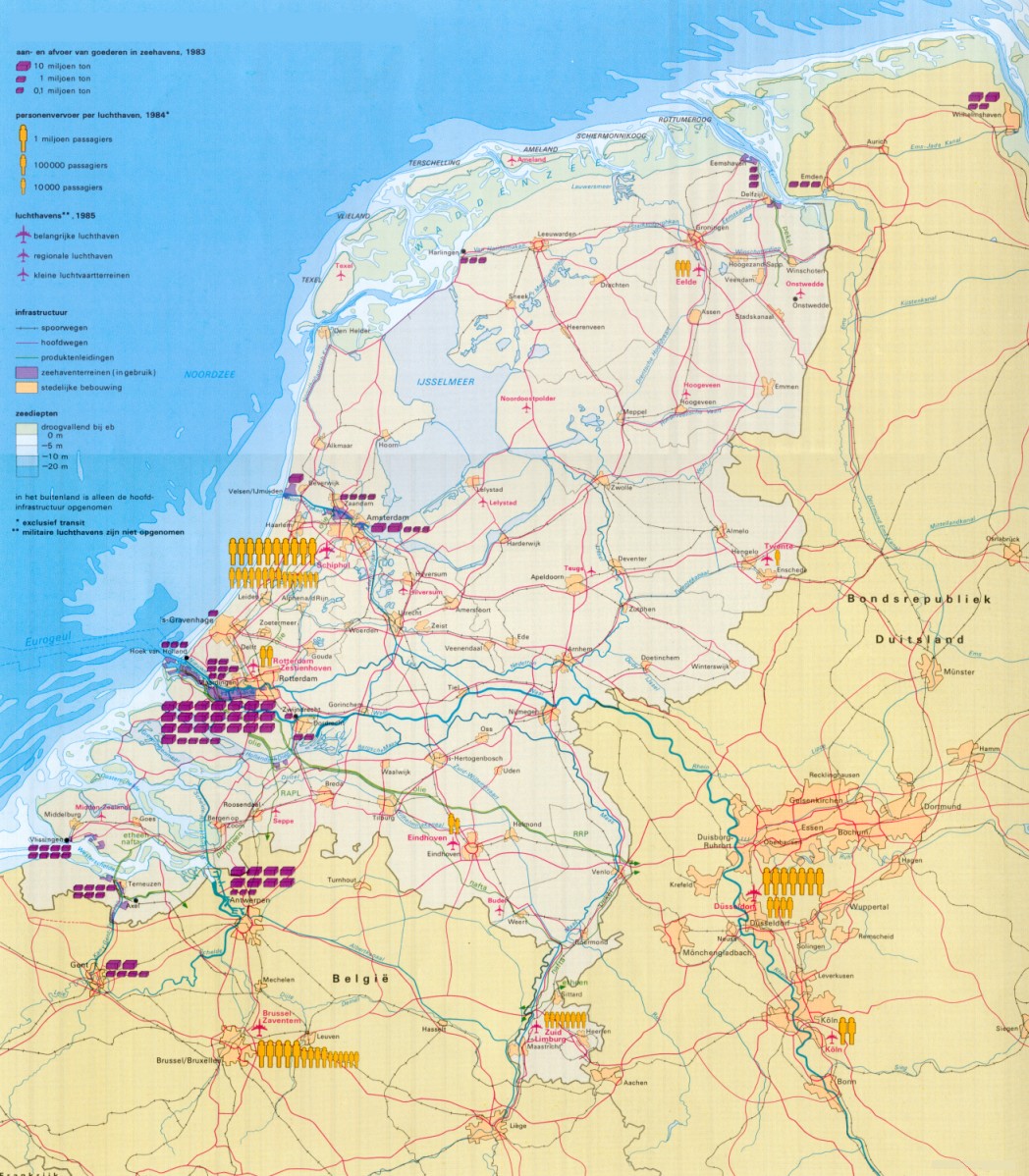| Uit de hoeveelheden omgeslagen goederen en de aantallen passagiers blijkt de belangrijke functie van Rotterdam respectievelijk Schiphol in vergelijking met de overige Nederlandse zee- en luchthavens. |
