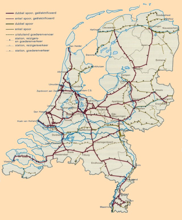 | In vergelijking met de wegeninfrastructuur is het spoorwegstelsel minder fijnmazig, terwijl de ontwikkeling sinds 1930 voornamelijk een inkrimping van het aantal verbindingen en stations laat zien. Daar staat tegenover dat op de hoofdverbindingen een kwalitatieve en technische verbetering is te constateren, ook versterkt door de sinds 1970 ingevoerde intercity-dienstregeling. Recente verbeteringen van het spoorwegstelsel kunnen vooral worden toegeschreven aan het forensisme. Dit betreft de opening van een aantal forensenstations, nieuwe verbindingen als de Zoetermeerlijn en de Nieuwegeinlijn, maar ook de aanleg van parkeervoorzieningen bij de diverse parkeer en reis-stations (P + R). |